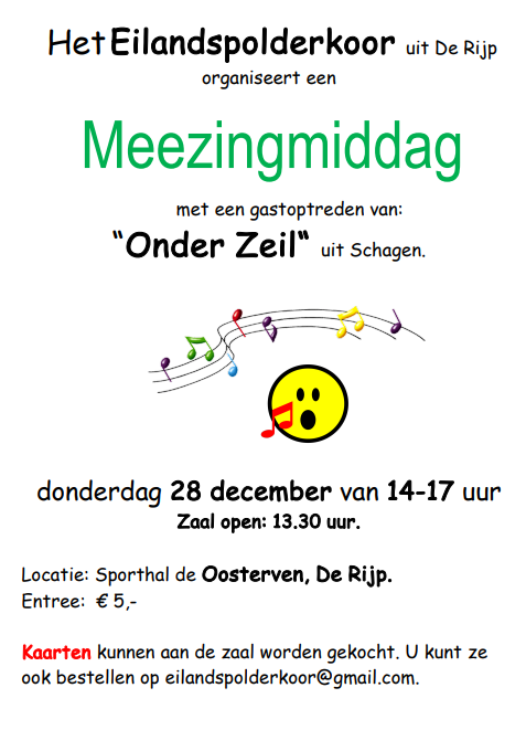 We organiseren jaarlijks tussen Kerst en Oudjaar een meezingmiddag waarbij een gastkoor optreedt. De entree voor belangstellenden is € 5,00 Familie, vrienden en kennissen van het Eilandspolderkoor en het gastkoor kunnen een kaartje aan de zaal kopen. Onze ervaring is dat sommige. niet-zangers bij de entree zeggen, “ja, maar ik kom mee met ……. ” en denken daarom niet te hoeven betalen, Dat is niet zo. Alleen de koorleden van beide koren hebben uiteraard vrij entree en krijgen bij binnenkomst een consumptiebon voor koffie/thee.
